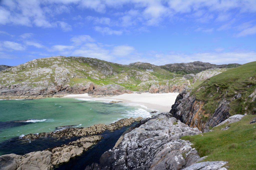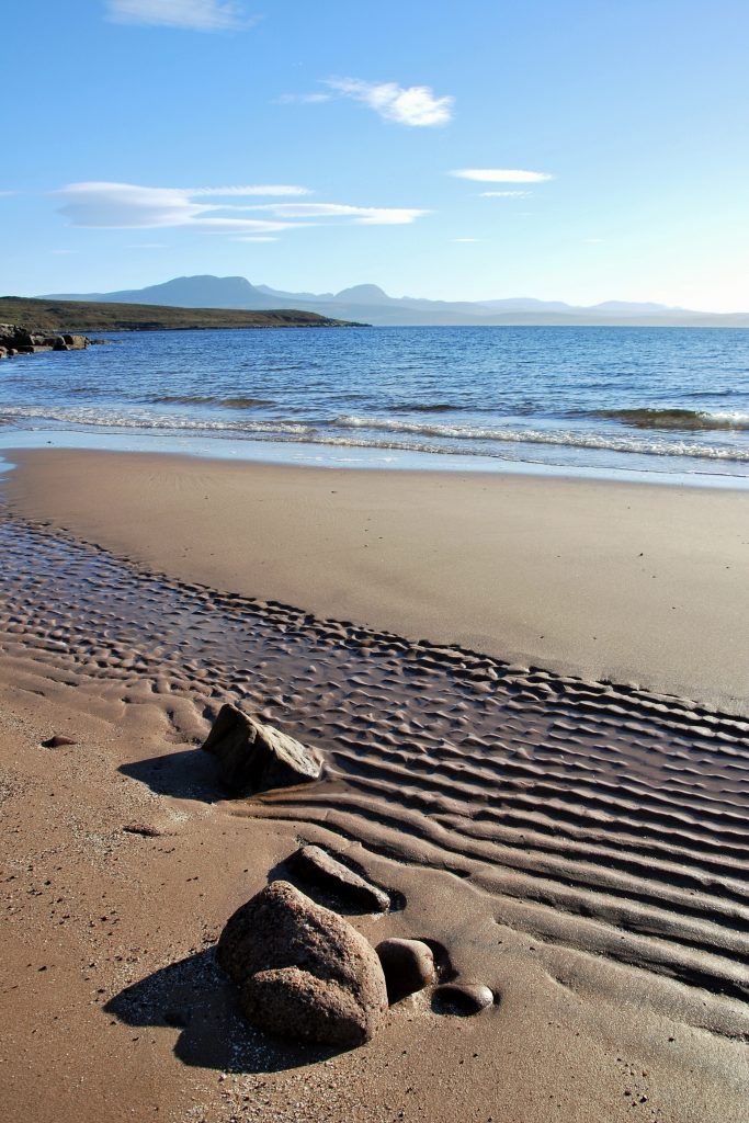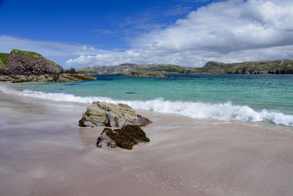 A hidden gem of a beach can be found at Acheninver. Drive through Achiltibuie and past Badenscallie then half a kilometre after the Acheninver Hostel car park, take the right fork in the road. After about 400 metres you will find a small area for parking on the left-hand side, just before the road bends to the left and crosses a small bridge. Park here, take the track to the right towards East Acheninver. Before the houses, turn left off the track onto a path across heather towards the shore. The ground can be a little boggy in places and it is rocky as you reach the shore, so sturdy footwear is recommended. Similarly to a lot of the beaches along the coastline, Acheninver is best appreciated at times other than high tide.
